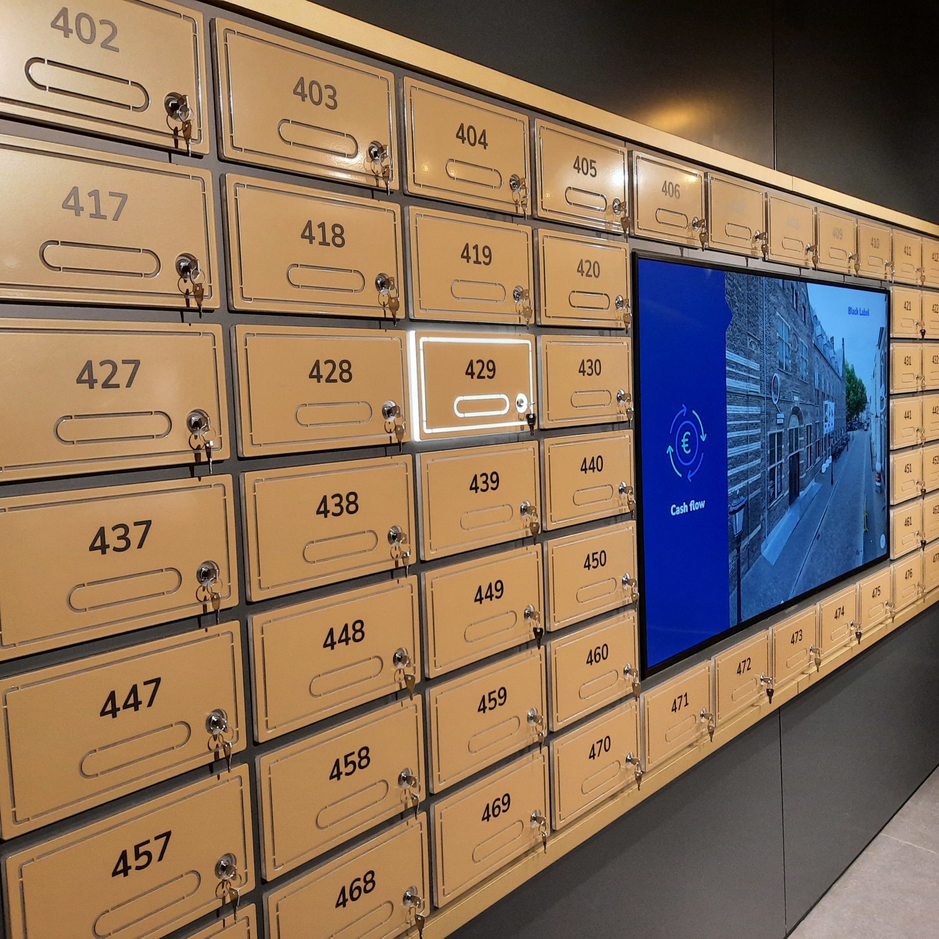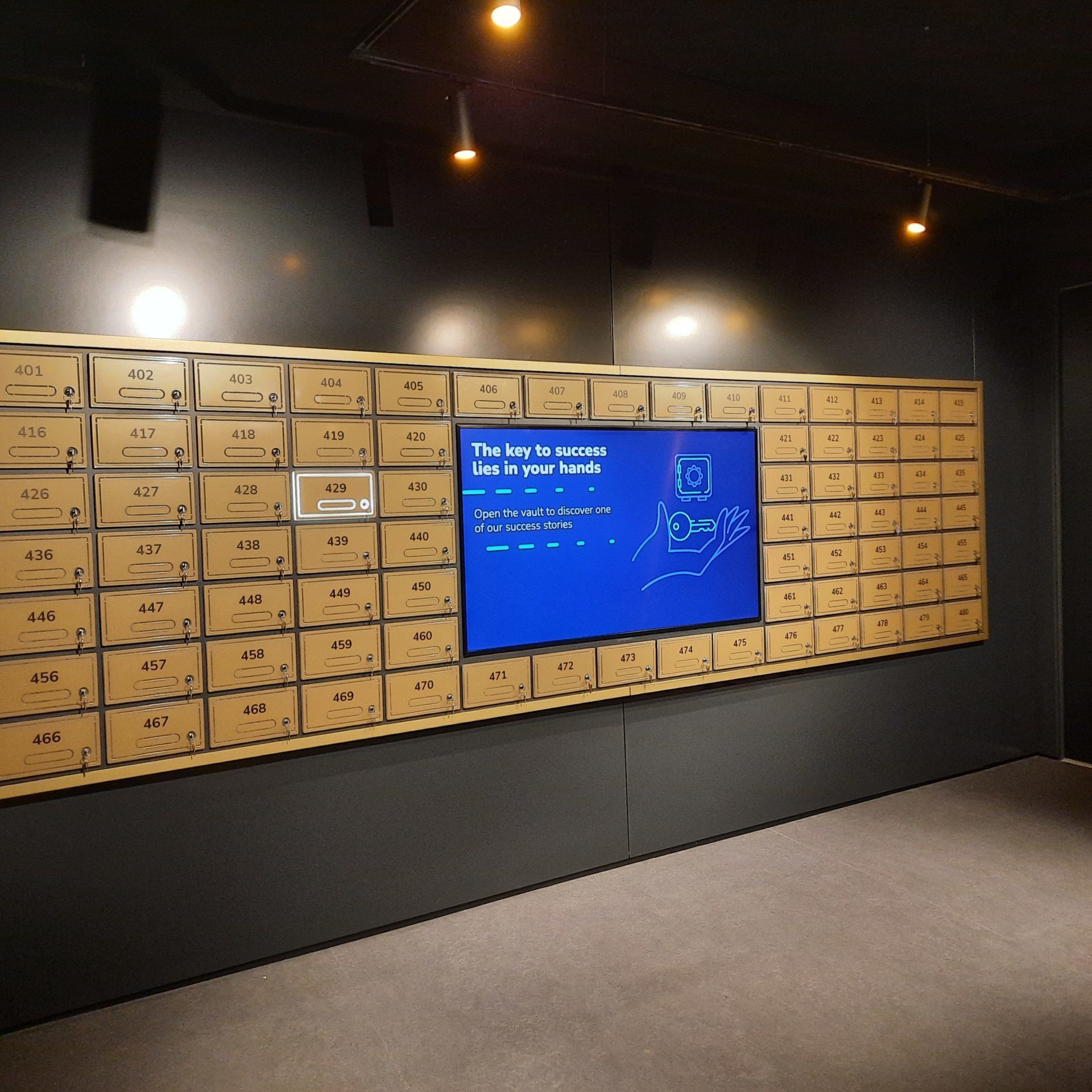 In de volgende ruimte die je betreedt bevind zich een grote kluisjeswand. Met elk hun eigen inhoud. Hier verdiep je verder in het bedrijf en geselecteerde producten. Door een sleutel om te draaien open je een kluisje en wordt er op het grote scherm informatie gegeven over het bijbehorende product of proces. Daarop aansluitend maak je kennis met de daadwerkelijke machines.