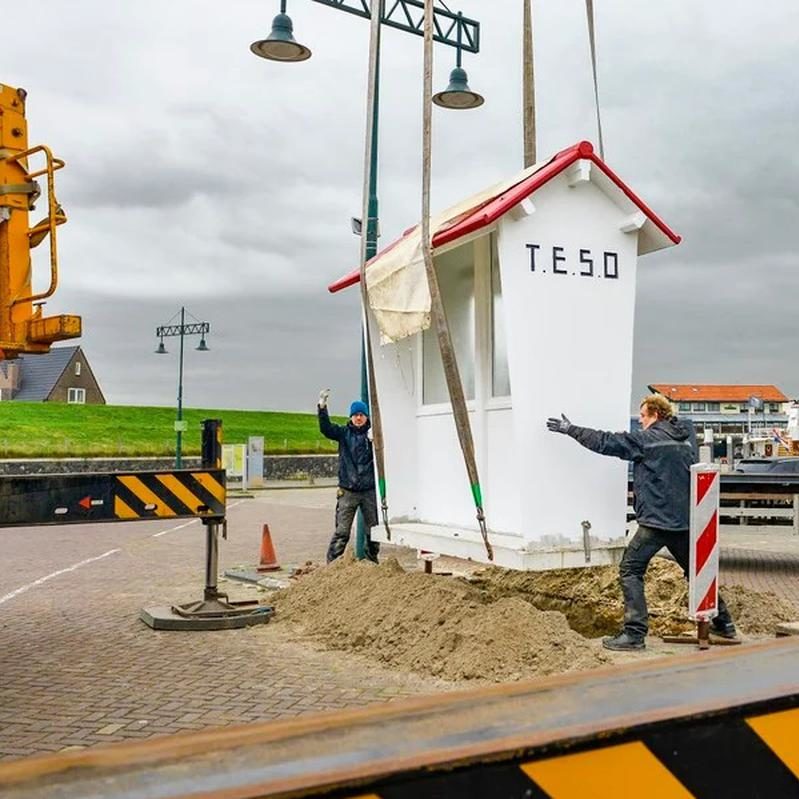 In de oude haven herleven oude tijden. Ooit was dit de aanlegplaats voor de veerboot. En destijds stapte je dus vanaf hier op de bus. Ter ere van dit verhaal hebben we een replica gemaakt van het originele bushokje. Gemaakt door Bart Boon.