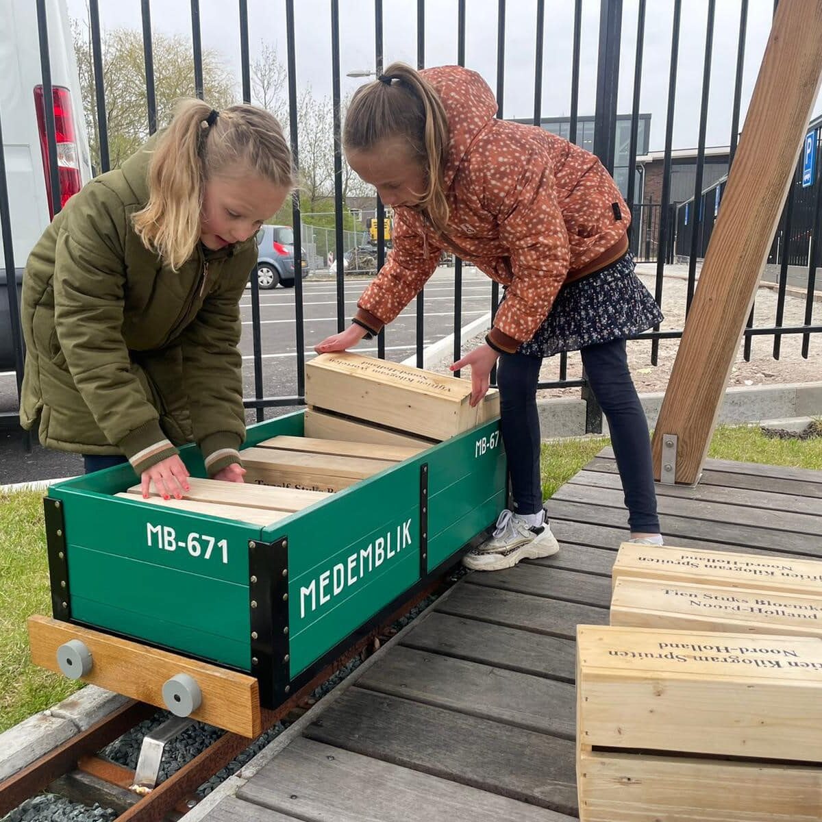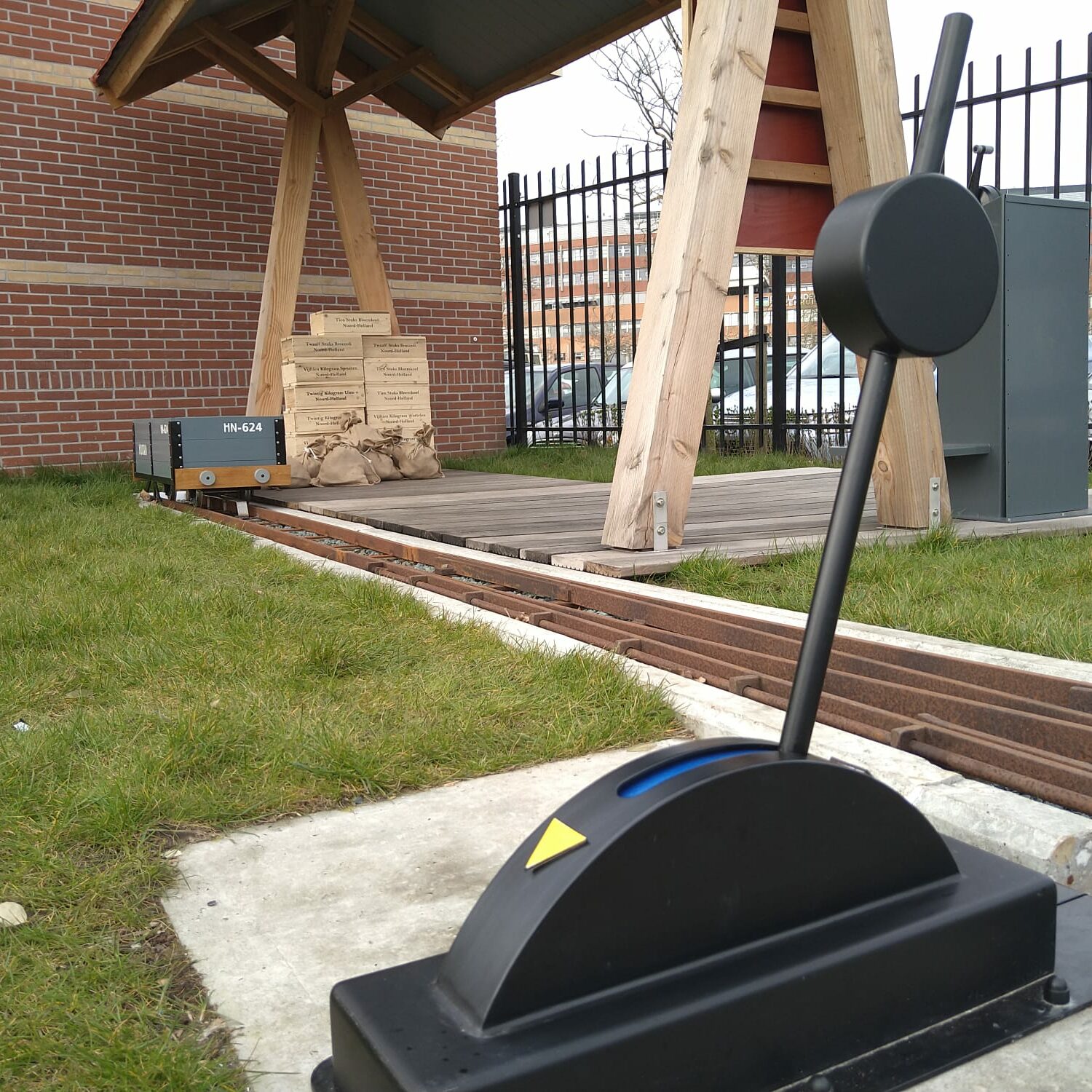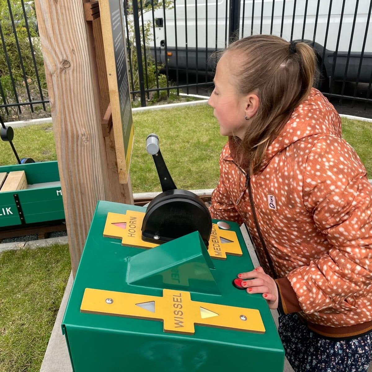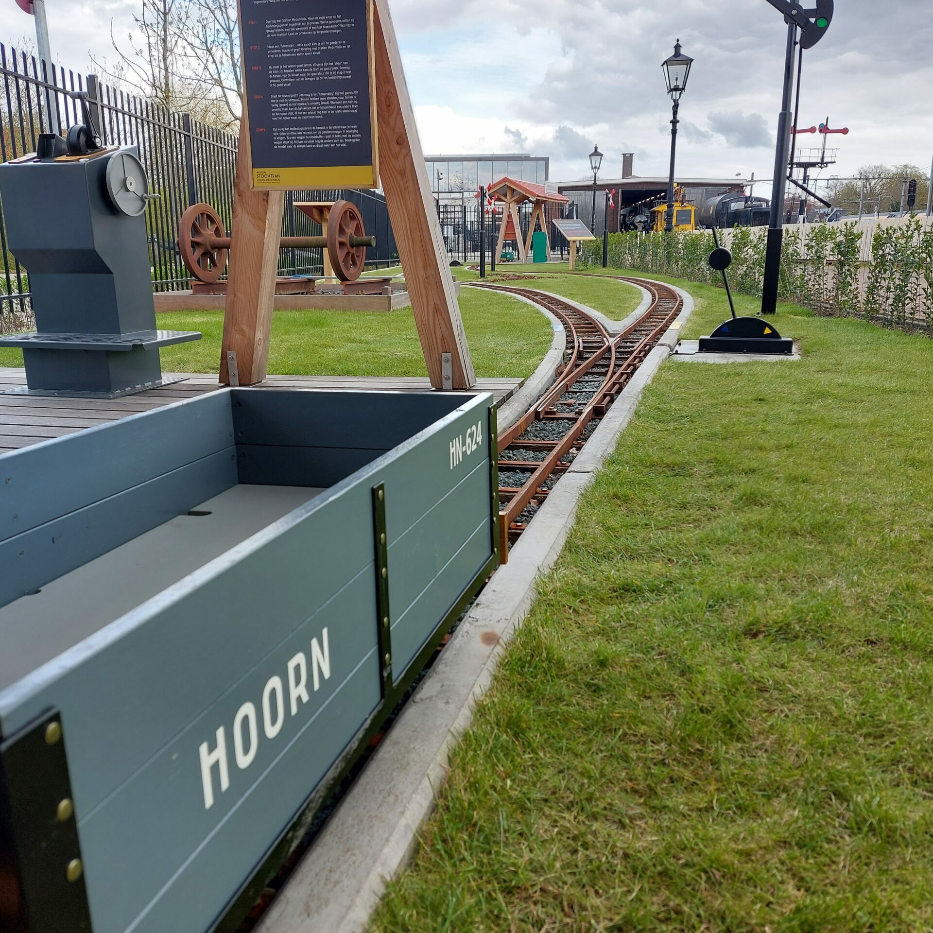 Zoals je hieronder ziet zijn de verschillende onderdelen uit de impressie tot leven gekomen op locatie. In de spoor-speel-tuin rijden de treinen met hun vracht van station Hoorn naar station Medemblik. Ontdek hoe wissels werken, laat de treinen rijden, laad en los en zorg dat je samenwerkt met het andere station.