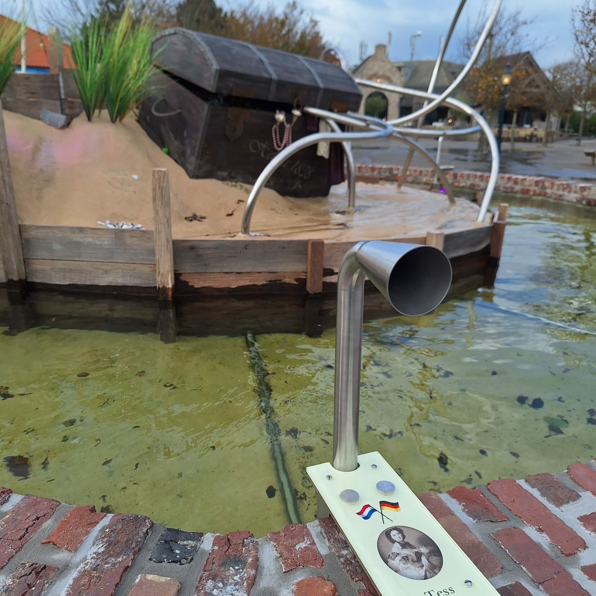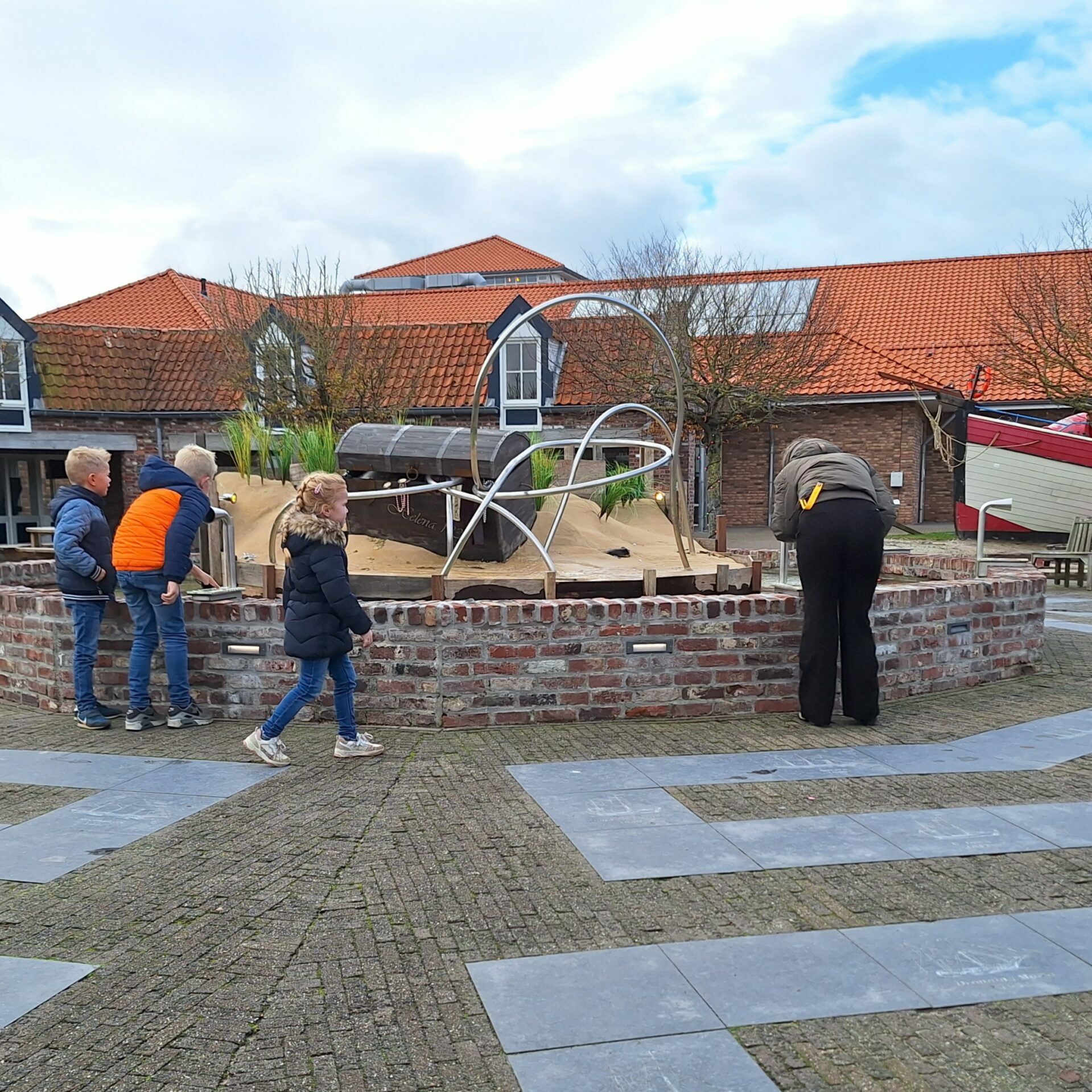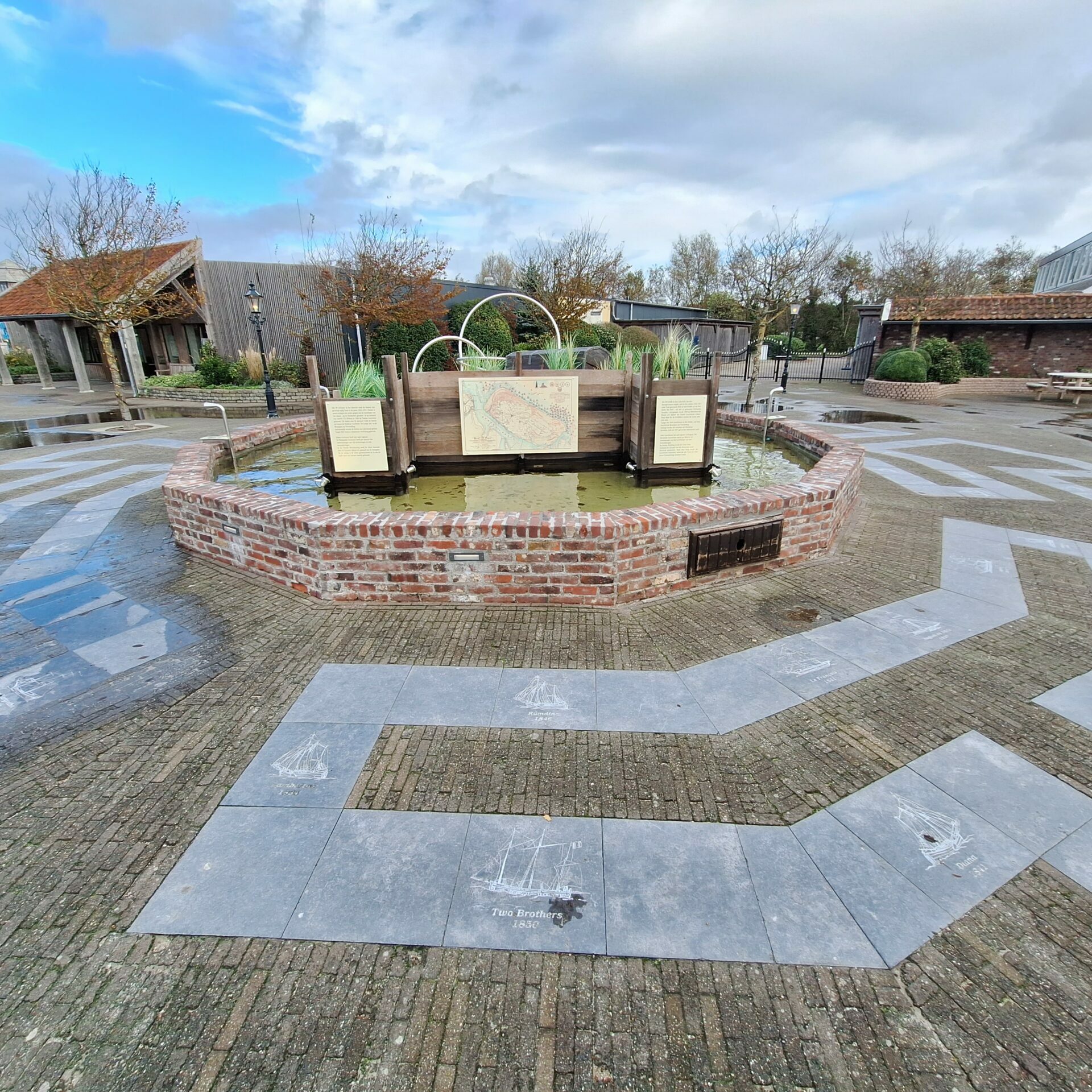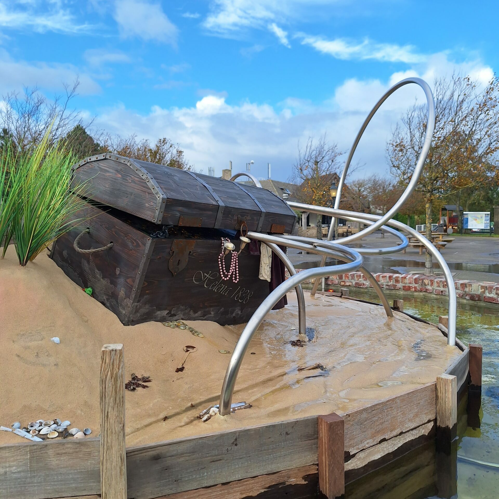 De kist en zijn verhalen werdt door ons nieuw gebouwd in 2012. Tussentijds is er nog een renovatie geweest maar nu was het tijd voor complete vernieuwing. Op het plein rond de fontein liggen stenen met daarop de schepen die zijn vergaan en horen bij het verleden van de Helena. Zo sta je dus midden in het verhaal.